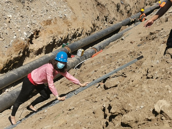 筆者帶好安全帽,也順著工人們下溝的唯一路徑----一個近乎垂直立在溝邊梯子下到溝里,每走一步,周圍的土就在"簌簌"的往下掉,筆者的心也跟著這些土渣心驚膽戰(zhàn)。來到管道溝里,兩根粗粗的管子并排向遠(yuǎn)方延伸去。管溝雖然深,但是并不寬,作業(yè)空間不大。