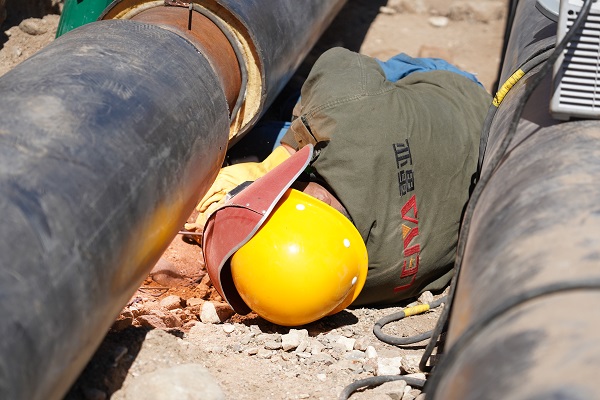 剛到現(xiàn)場,眼前是一大片比人還高的土堆,跟著現(xiàn)場的工作人員,繞著土堆走了大一圈,才看到了5米多深的管溝。當(dāng)天正是二十四節(jié)氣中的小暑,雖然在前兩天剛下過一場大雨,但絲毫沒有消減半分暑氣,但是溝內(nèi)的工人們,沒有因為天氣炎熱而消極怠工,按照安全生產(chǎn)的著裝要求,頂著毒辣的太陽,全副武裝、緊鑼密鼓地干著手中的活。豆大的汗珠順著他們黝黑的臉不停的滴落,但他們似乎完全沒感覺到。